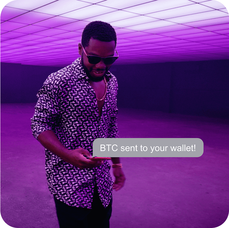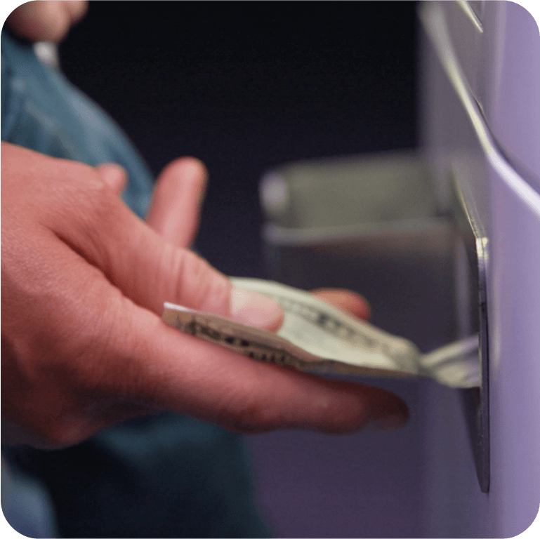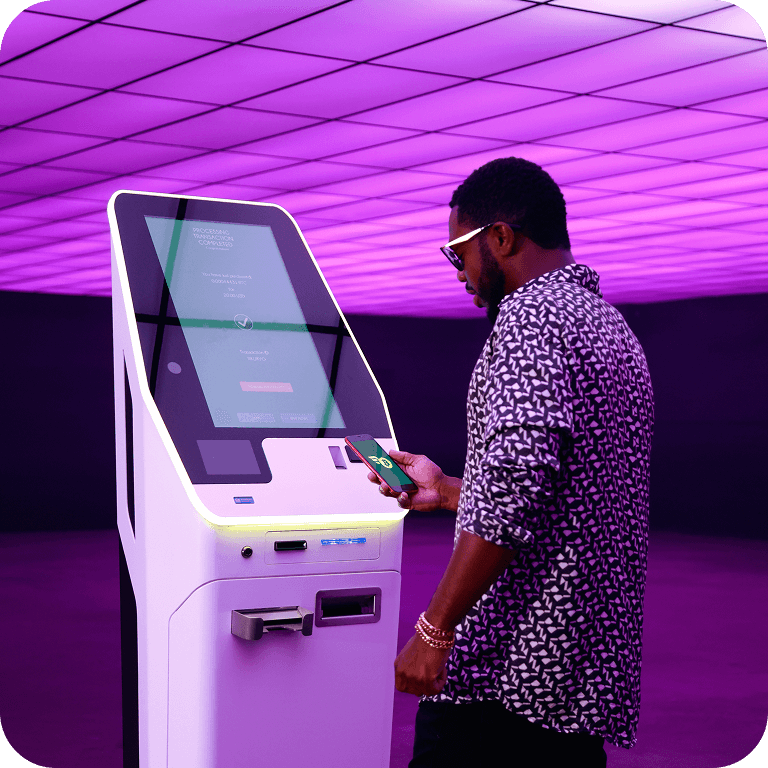 Machine prints a ticket showing: The exact amount of bitcoin to send & The QR code address for sending. Receive text updates. Once confirmed, press “Withdraw Cash,”